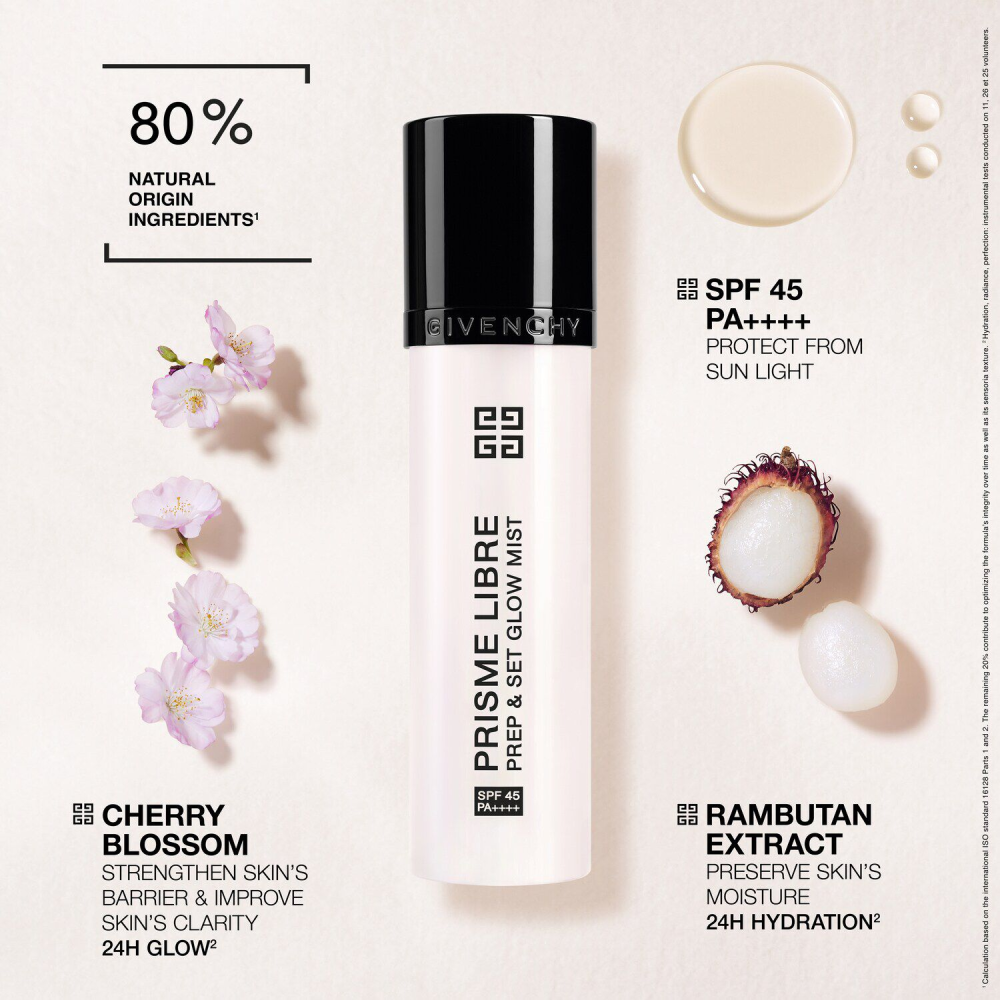 نقدم لكِ الرذاذ الأول من نوعه الذي يقوم بكل المهام: رذاذ بريزم ليبر بريب آند سيت جلو هو أول بخاخ برايمر وتثبيت للمكياج من جيفنشي بمعامل حماية SPF45 PA++++. رذاذ متكامل 4 في 1 لتحضير البشرة وحمايتها وتثبيت المكياج وتجديده طوال اليوم.