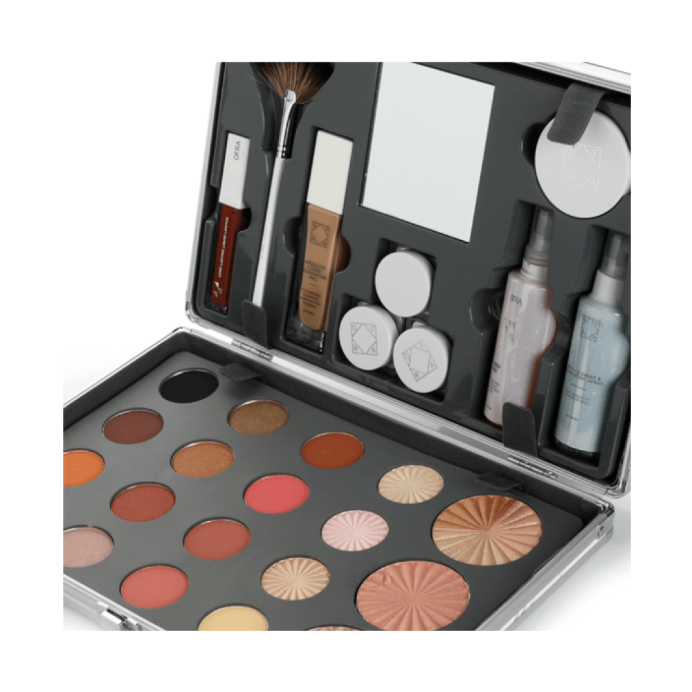 تحتوي على عدة ألوان من ظلال العيون البرونز احمر الخدود والاضاءة، بالاضافة لكريم أساس ومثبت مكياج وجل حواجب وجل كحل العين وفرشاة اضاءة و بودرة شفافة لامعة في حقيبة واحدة.