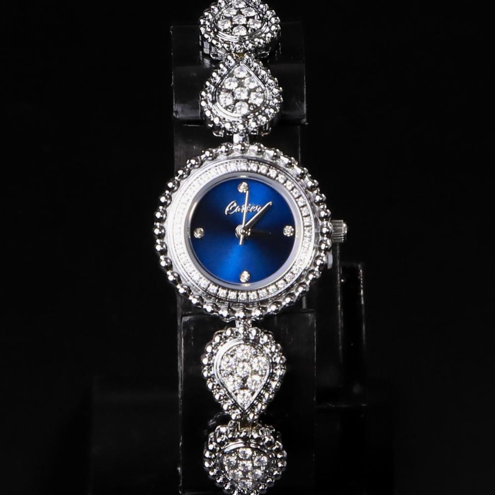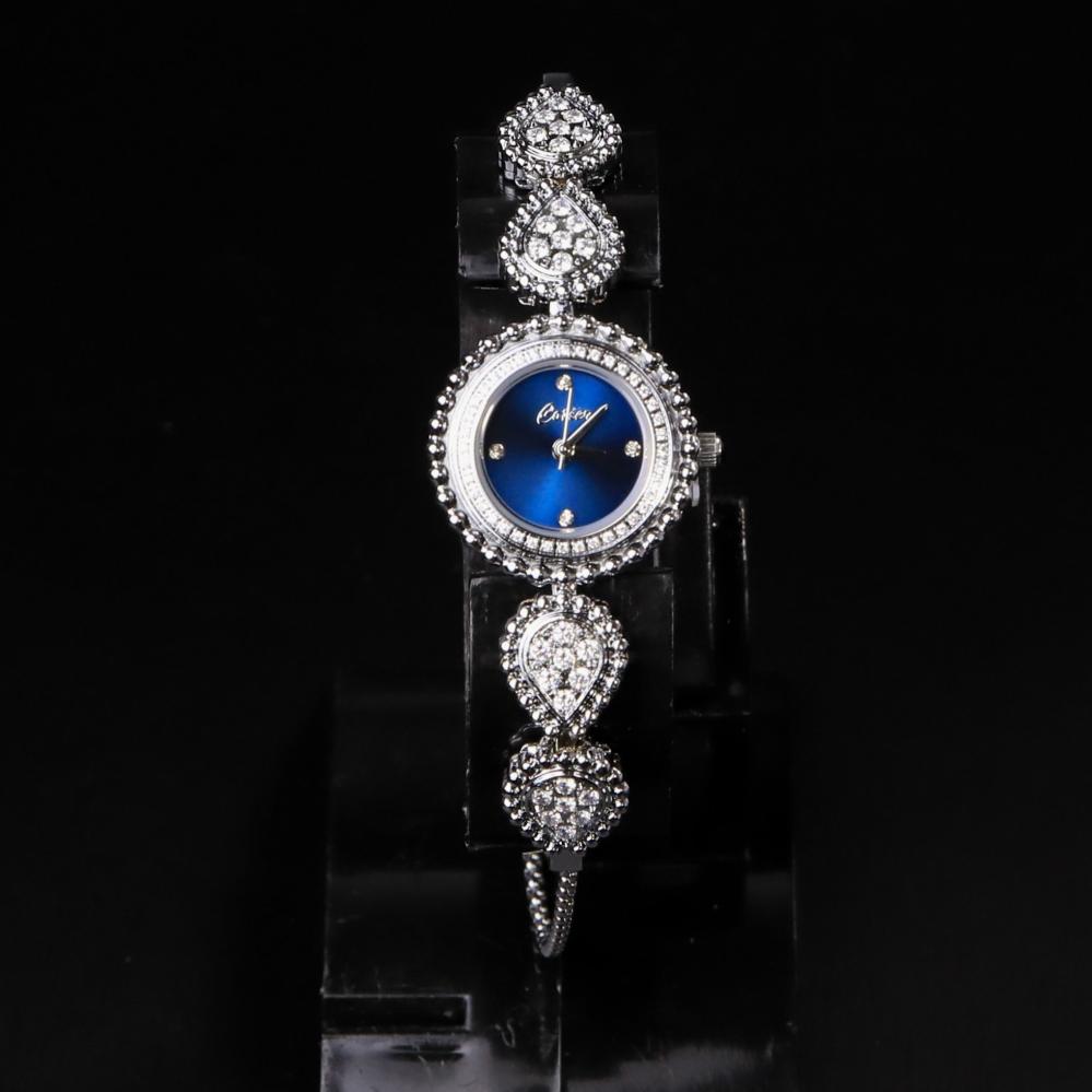 ساعة نسائية فاخرة لون فضي بلون ميناء ازرق بضمان