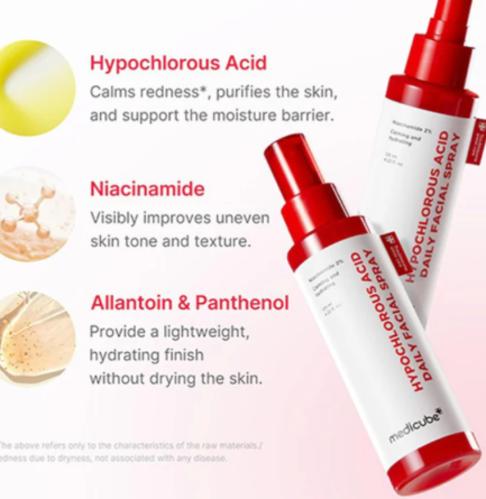 تركيبته الغنية بـ Hypochlorous Acid تعمل على تقليل البكتيريا على سطح البشرة، تهدئة الاحمرار، وتقليل التهيج، مع ترطيب خفيف وتجديد التوازن لحاجز البشرة.